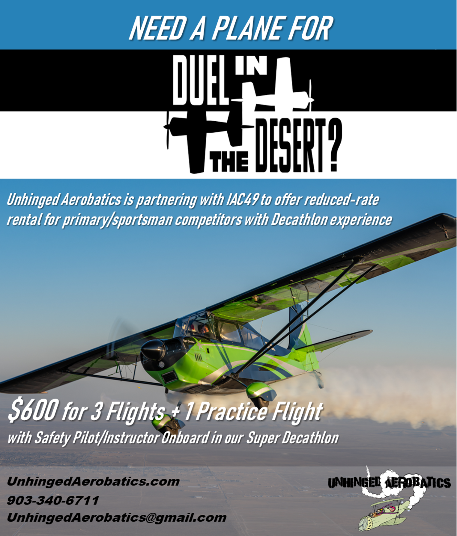 Unhinged Aerobatics has also generously offered their Super Decathlon for competition rental with a safety pilot at a reduced rental rate for Primary and Sportsman Competitors. Please reach out to Justin Rhines at UnhingedAerobatics@gmail.com to secure a spot before they are full!