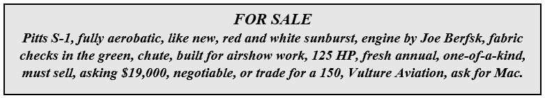 5. "Engine by Joe Berfsk" — Who in (blank) is Joe Berfsk? And what did he do to the engine? With a name like that I wouldn't taxi it around the ramp. He probably has a good reputation back in "Podunk Center," but these ads are also trying to sell a Pitts to a buyer in California.