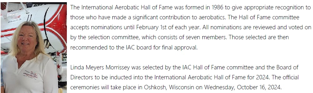 "I am convinced that my own success as a three-time U.S. National champion and sixteen-year member of the U.S. Unlimited Aerobatic Team can be tied directly to Linda through her coaching," said IAC Director Emeritus Debby Rihn Harvey.